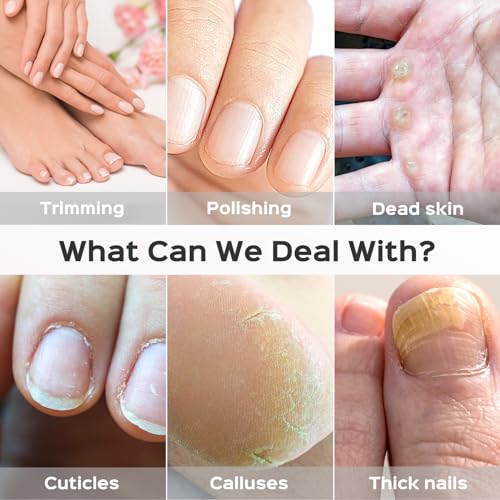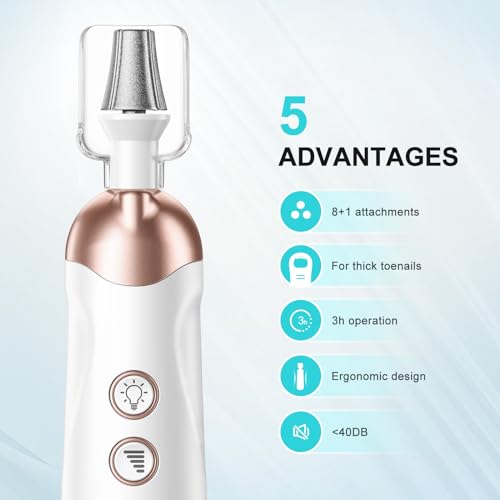 【Adjustable Speeds And Direction】5 speed settings for 2,000 to 5,000 RPM nail drill machine. You can use low speed for delicate areas and high speed for smooth corns and calluses. With clockwise/counterclockwise rotation, you can easily adjust the speed and direction of the nail clipper to suit your needs. The powerful motor ensures precise and efficient electric nail care kit, while the low noise level (<40dB) ensures a comfortable experience.Make daily hand and foot care more comfortable.