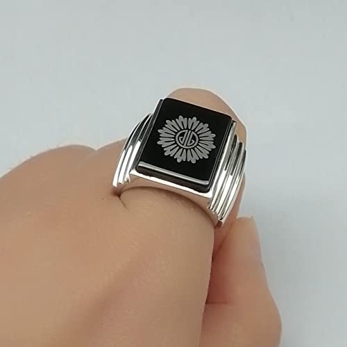 The ring is made of 925 silver and is set with black onyx stones, which are stamped with a daisy motif or the family crest symbol.