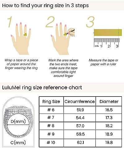 Ring Size Selection Guide Step 1: Wrap a step or a piece of paper around the finger wearing the ring Step 2: Mark the area where the two ends meet, make sure the tape comfortable tight around finger Step 3: Measure the tape or paper with a reler Step 4: Write down your finger data and refer to the ring sizing chart to choose the right ring