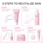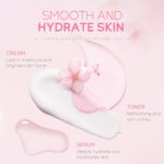 【Cleanses & Nourishes Skin】: The toiletries travel kit is infused with cherry blossom extract. Firstly, use the cherry blossom cleanser to clean the face. Secondly, apply the toner, serum, and face cream to moisturize dry skin. Finally, use the eye cream to reduce dark circles. This is an ideal gift for you to keep your skin clean and youthful.
